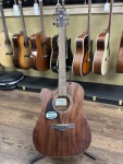 The left-handed Ibanez Artwood AW54LCE acoustic-electric guitar hits all the right notes. Acoustically, the AW54LCE delivers big dreadnought tone, thanks to its solid okoume construction. The guitar's warmth is ideal whether you're strumming or fingerpicking, and the Ibanez under-saddle pickup and preamp deliver natural-sounding amplification that's plug-and-play simple. If you're looking for a great-sounding, smooth-playing acoustic-electric that's also a phenomenal value, we can highly recommend the Ibanez AW54LCE.